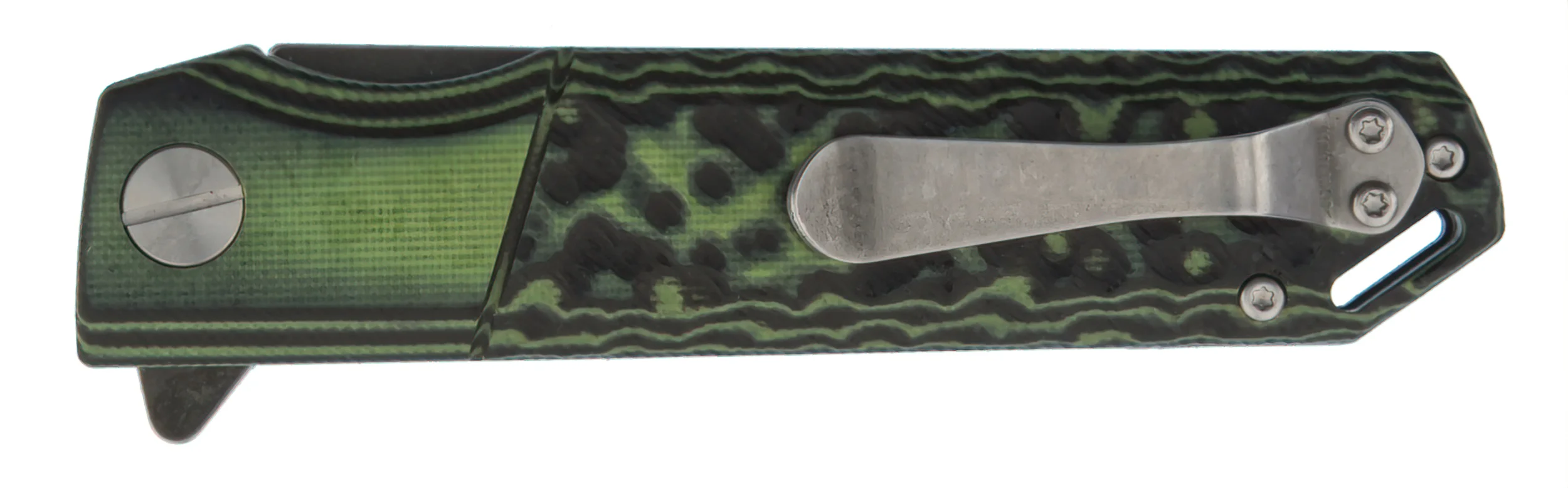 Rękojeść o długości 115 mm została wykonana z wytrzymałego materiału G10 w atrakcyjnym zielono-czarnym wykończeniu. Zapewnia ona pewny i komfortowy chwyt w każdych warunkach, nawet gdy dłonie są wilgotne. Otwieranie i zamykanie noża jest niezwykle płynne dzięki zastosowaniu łożysk kulkowych. Za bezpieczeństwo użytkowania odpowiada solidna blokada typu liner lock, skutecznie chroniąca przed przypadkowym złożeniem ostrza.